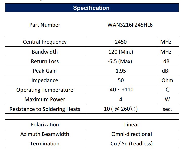 1. Chip Antenna 2.4G or BT or Wi-Fi 2.4G / 雙極 Chip Antenna / WAN3216F245HL6
